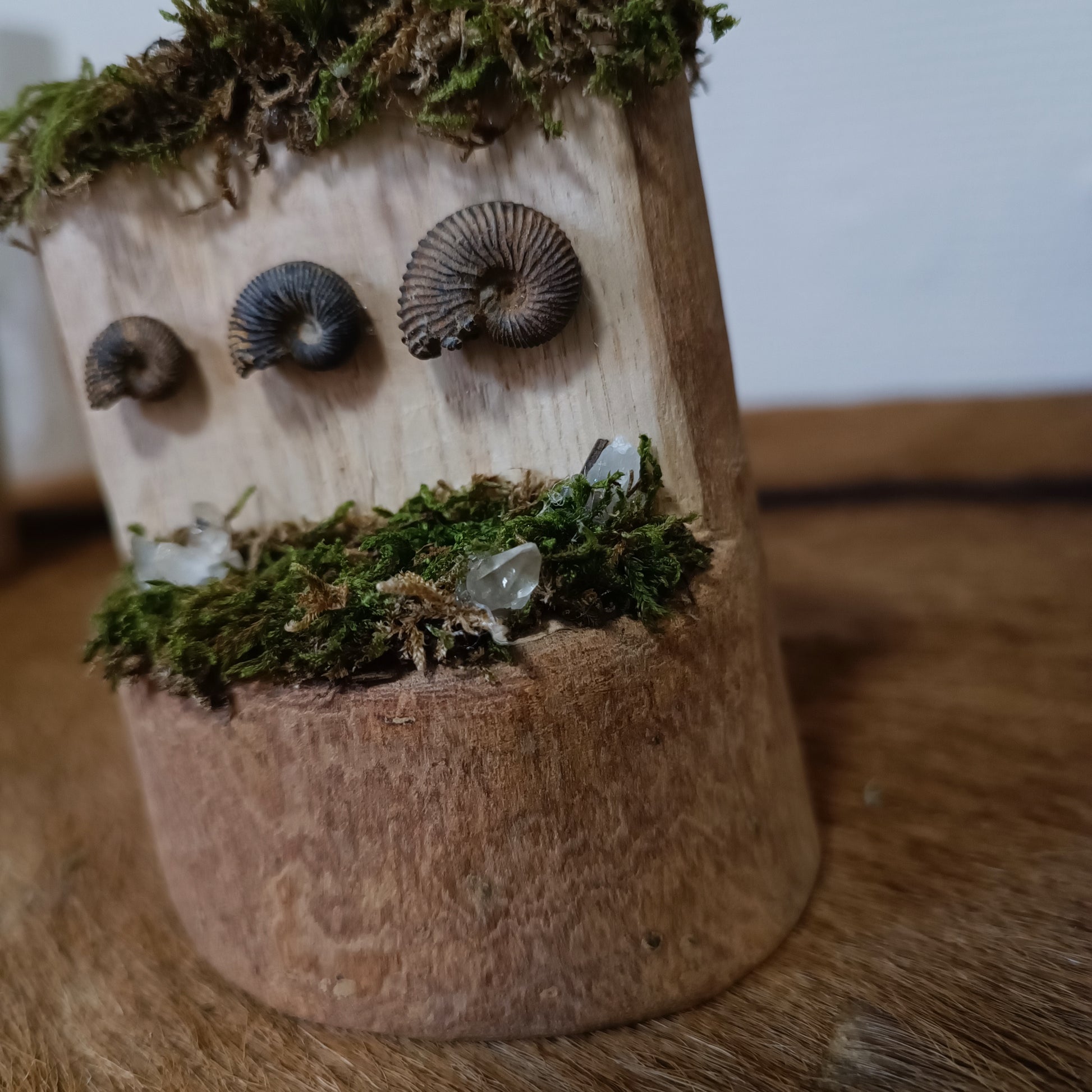 La capsule ammonite, une capsule de curiosités qui fascine. Les fossiles d'ammonites ce mélange à merveille avec la mousse mais nous charme en étant mis en valeur dans ce socle en bois. Elle est composée de trois ammonites de taille différente pour proposer une capsule qui captive tous les regards.