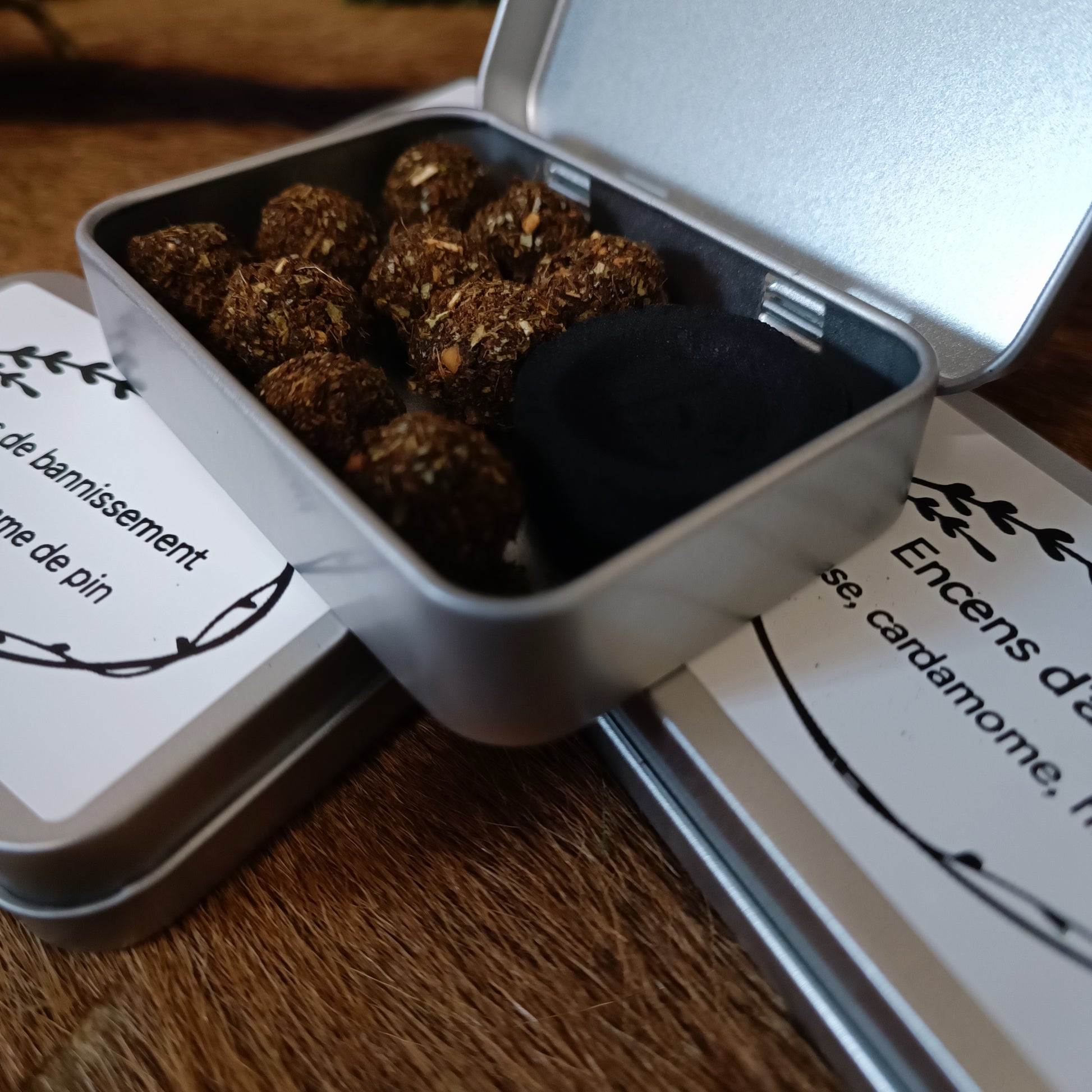 Les encens en bille artisanale de Didi sont à utiliser avec charbon ardant. Placer une bille sur un charbon est laisser la fumée faire son travail. Dans la boîte en métal il y à 10 billes et un charbon.